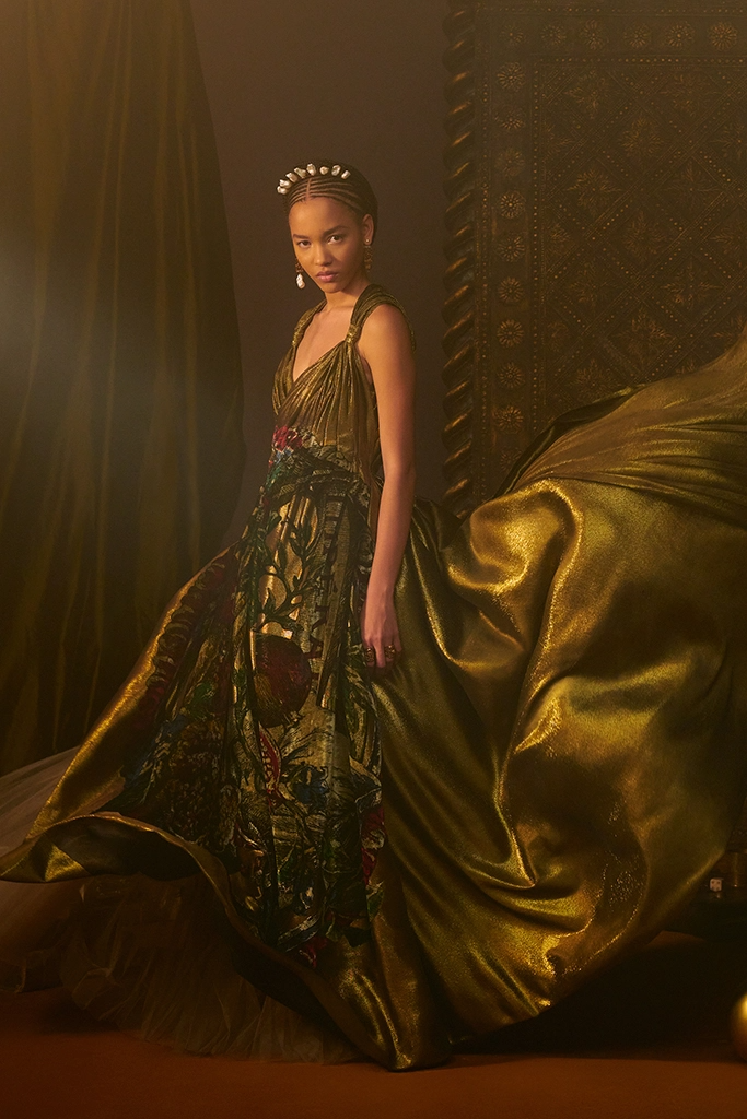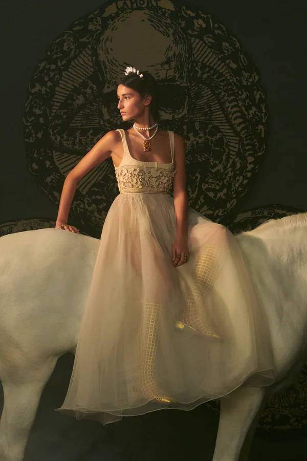 The element of metal, cold and calculating. The play of light and shadow, quicksilver freedom. Strength and elegance in motion. The simple silhouette of Empire-era dresses received a dynamic force